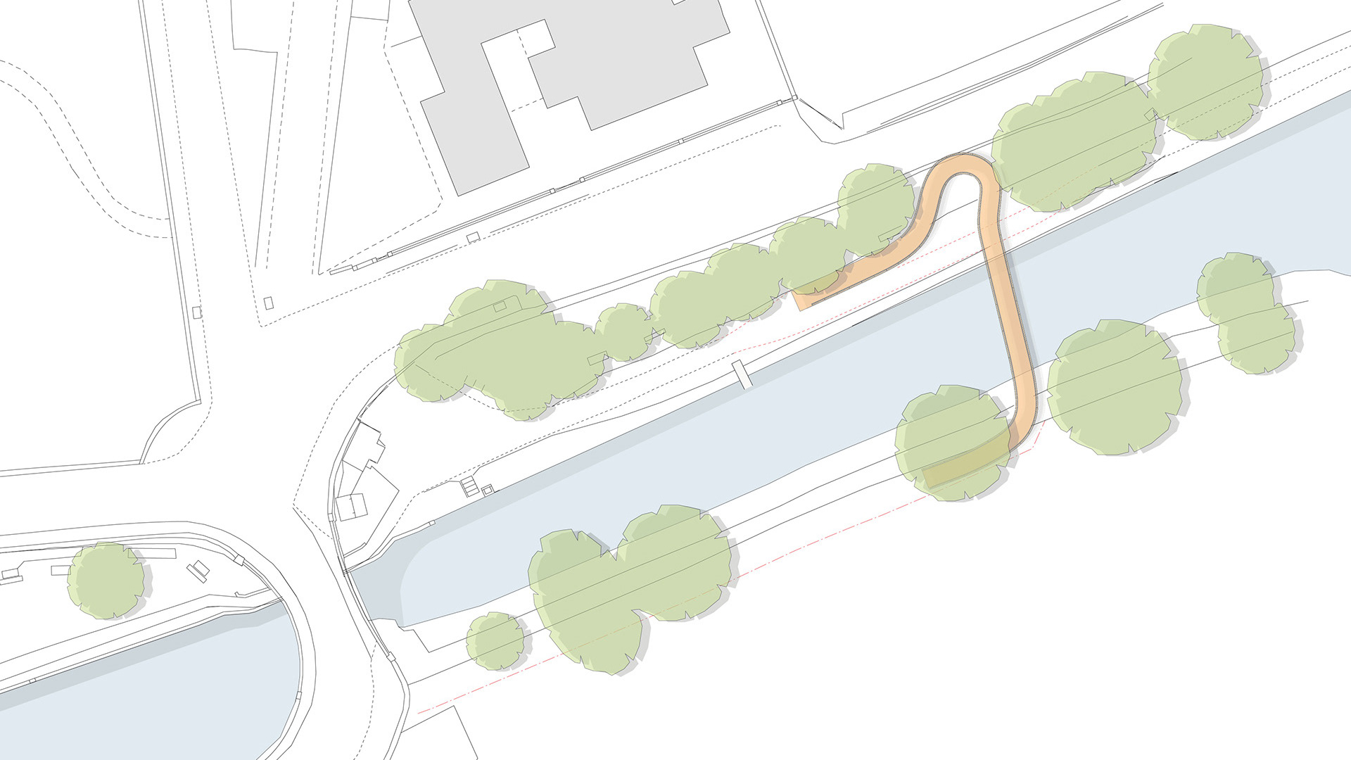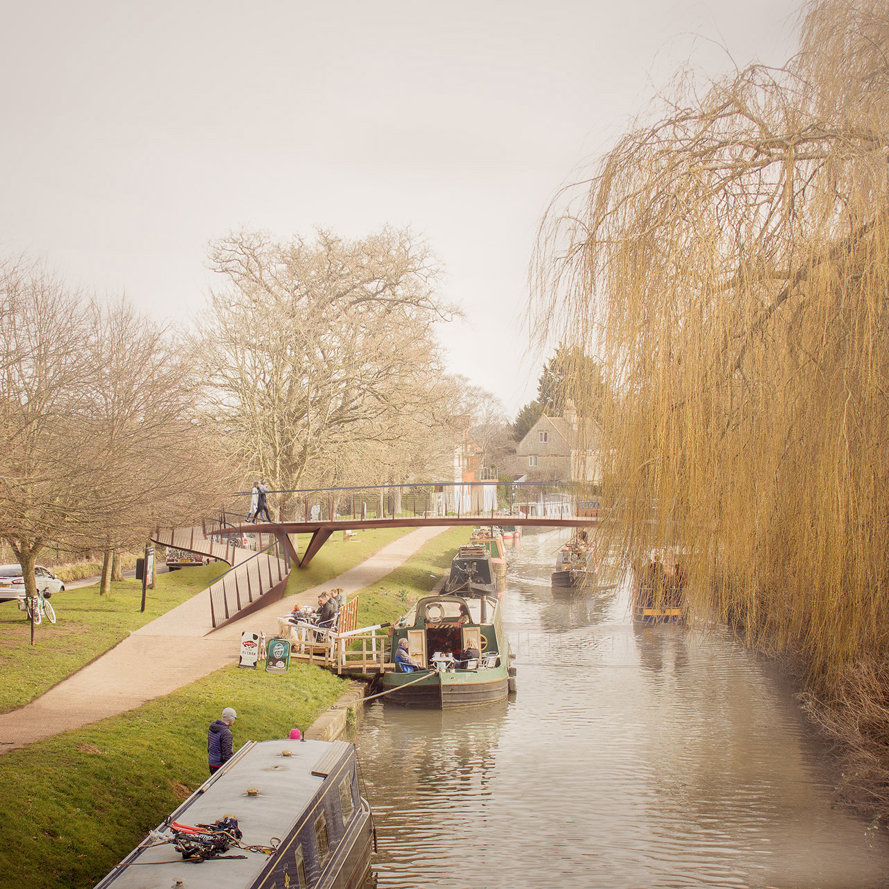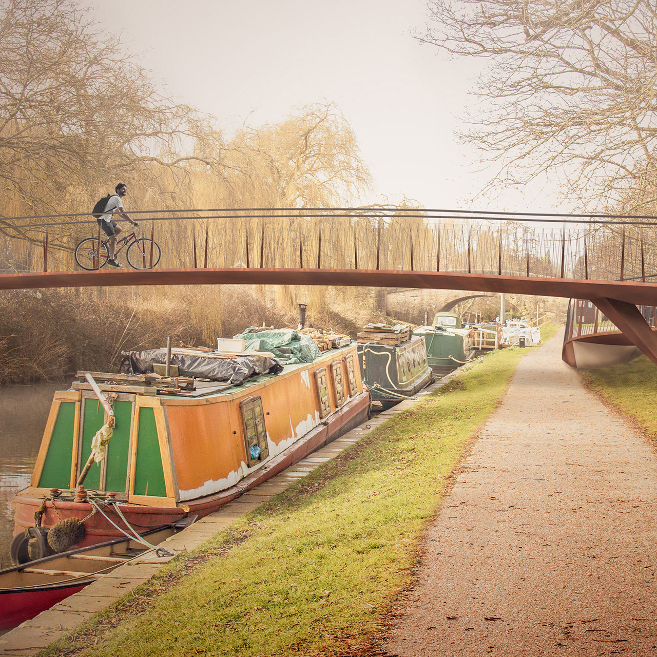 The primary structure is formed from pre-weathered steel to minimise long-term maintenance and allow the bridge to blend naturally with its surroundings. Stainless steel handrails and a resin-bound gravel deck surface continue the material language of the canal path as it rises onto the bridge. Minor landscaping adjustments, including path realignment and subtle level changes, help integrate the structure into the site.